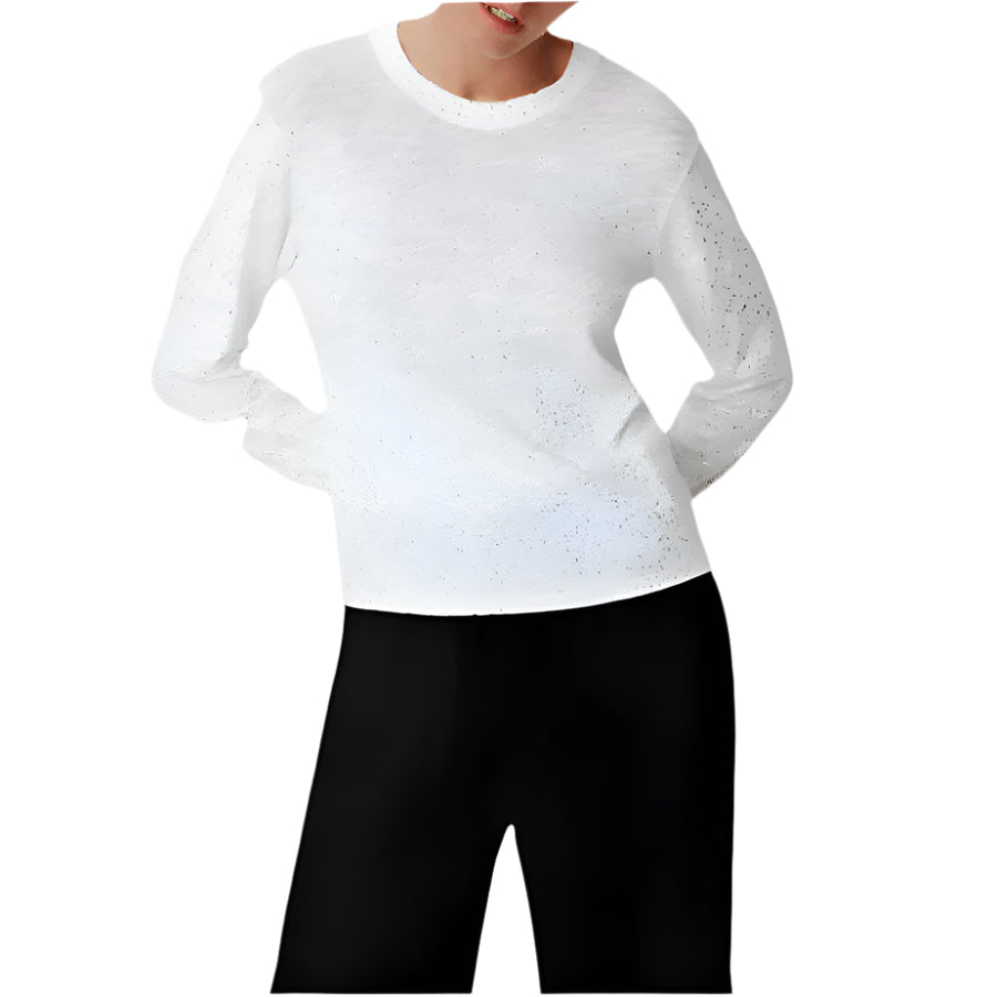 The Slub Jersey With Foil Long Sleeve Crop Tee gets its texture from the uneven yarns of unique Peruvian Cotton. It features a relaxed crew neck silhouette and metallic foil treatment. The loose weave of this heavier Cotton meets the slightly shrunken cut of the hem.