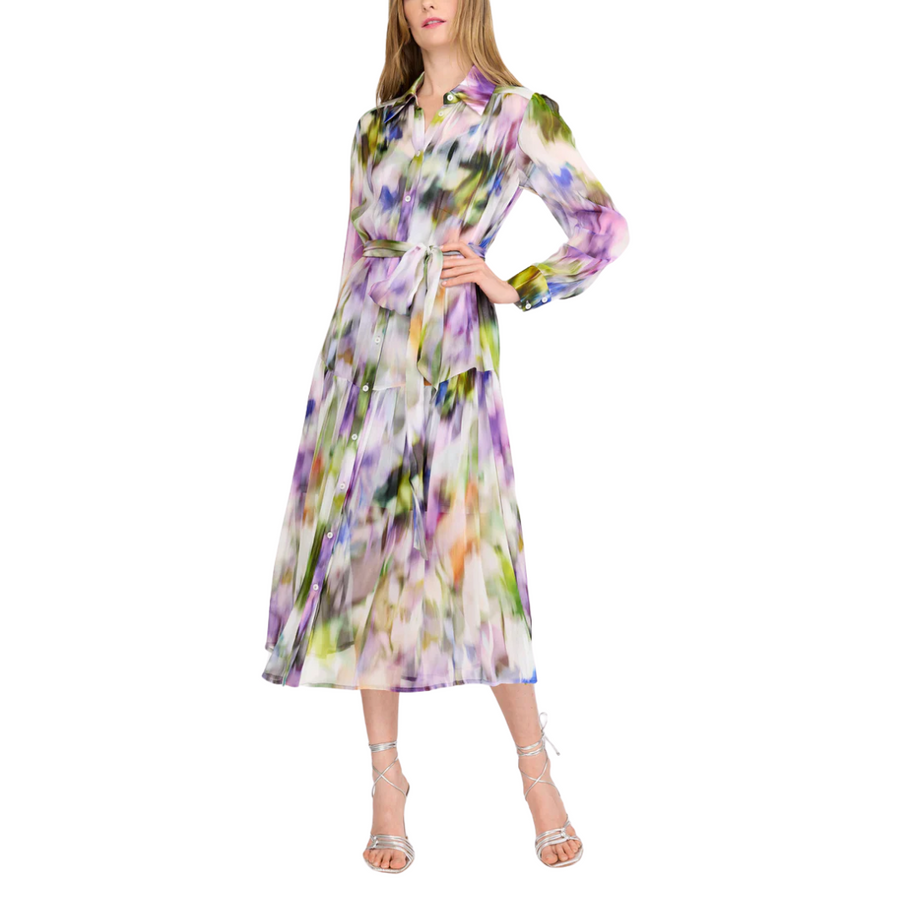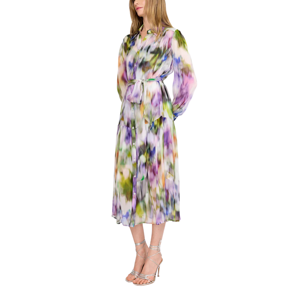Introducing our Kristen dress, with satin sleeve cuffs and collar. The chiffon fabrication lends a whimsical mood to the dress and creates movement in your silhouette. She fastens with Christy Lynn mother-of-pearl buttons down the front placket, ties at the waist with a sash belt, and ships with a matching stretch slip. Her timeless design allows for easy accessorizing whether with delicate jewelry and heels for a formal look or with sandals for a more relaxed vibe. This style is ideal for weddings, garden parties, or evening gatherings.