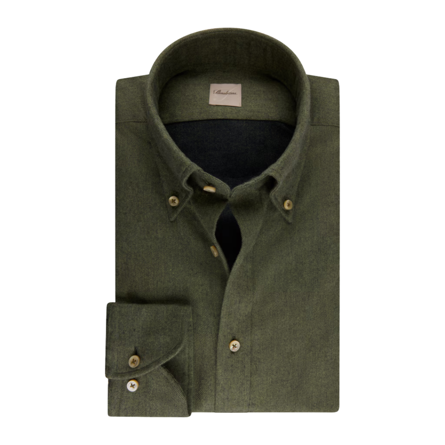 This flannel shirt is made of twofold cotton. The shirt is detailed with mother of pearl buttons, single cuffs and a button down collar.