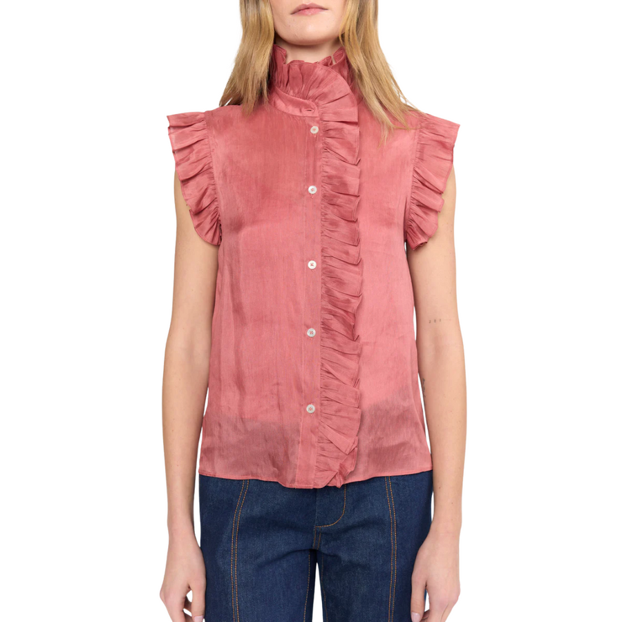 Featuring an asymmetrical ruffle that elegantly wraps around the neck and cascades down the front placket, this top lends a touch of refined texture and movement. Additional ruffles on the sleeves enhance its feminine appeal. Versatile in styling, it pairs seamlessly with skirts, pants, or shorts and can be worn tucked in or left out for a polished look suitable for various occasions. Includes a matching stretch slip.
