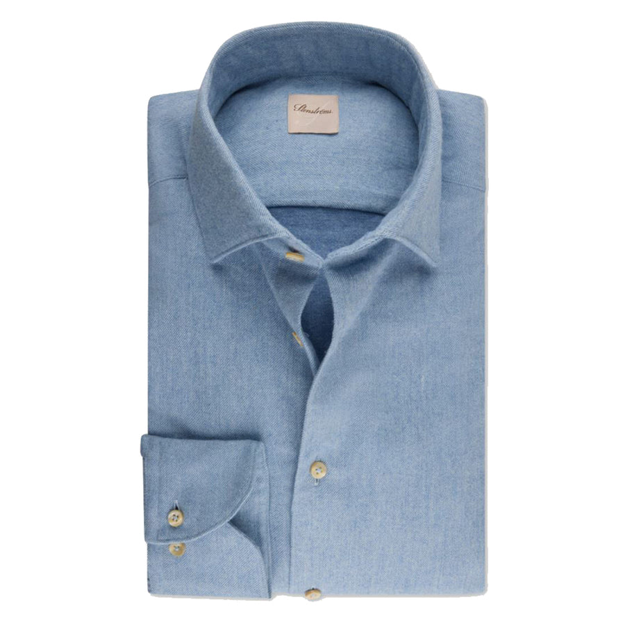 This flannel shirt is made of twofold cotton. The shirt is detailed with mother of pearl buttons, single cuffs and a cut away collar.