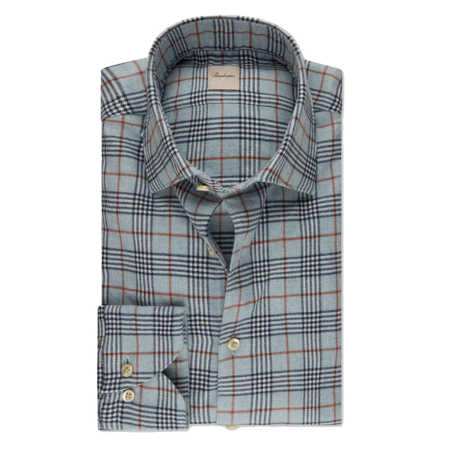 This checked flannel shirt is made of twofold cotton. The shirt is detailed with mother of pearl buttons, single cuffs and a cut away collar.