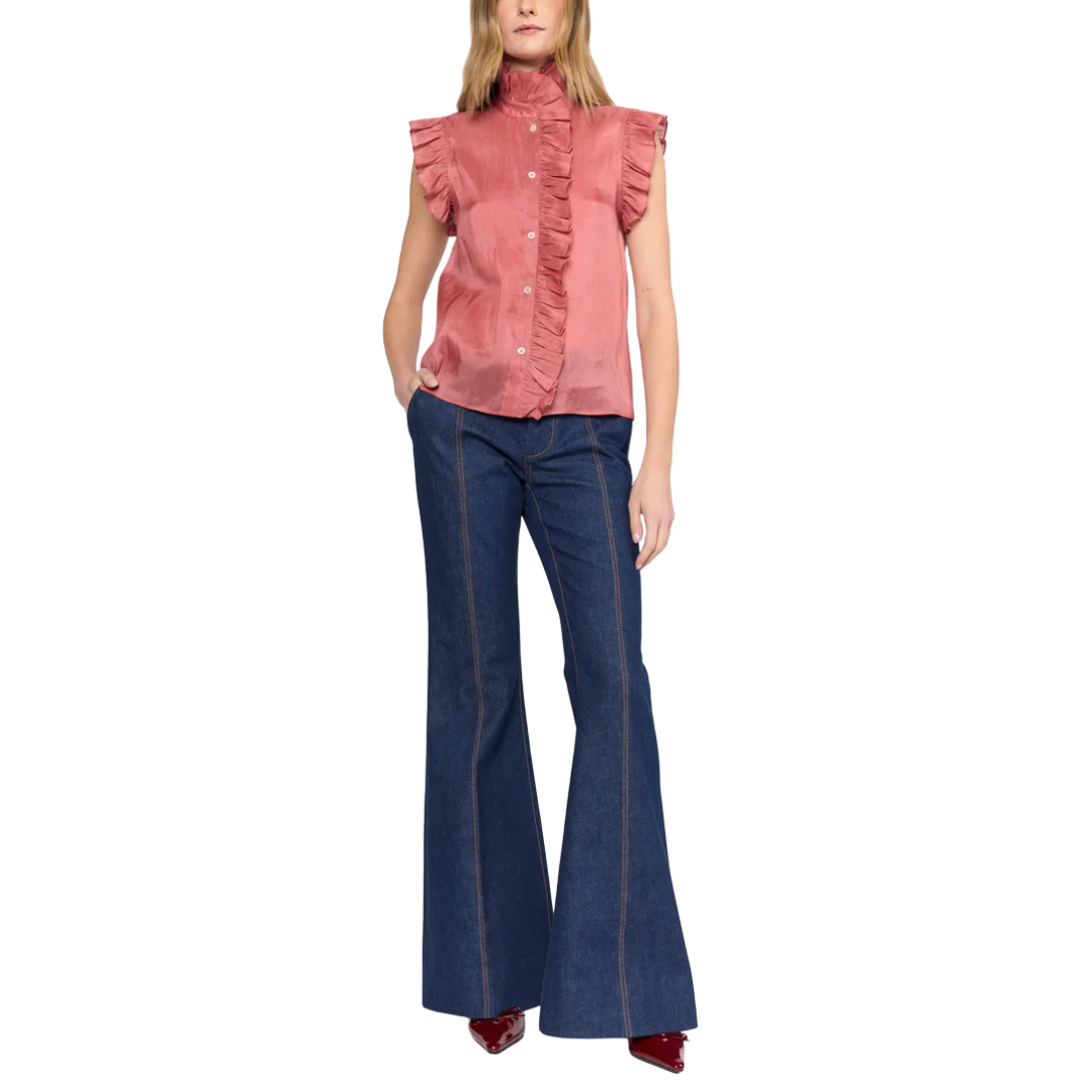 Featuring an asymmetrical ruffle that elegantly wraps around the neck and cascades down the front placket, this top lends a touch of refined texture and movement. Additional ruffles on the sleeves enhance its feminine appeal. Versatile in styling, it pairs seamlessly with skirts, pants, or shorts and can be worn tucked in or left out for a polished look suitable for various occasions. Includes a matching stretch slip.