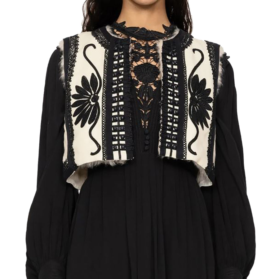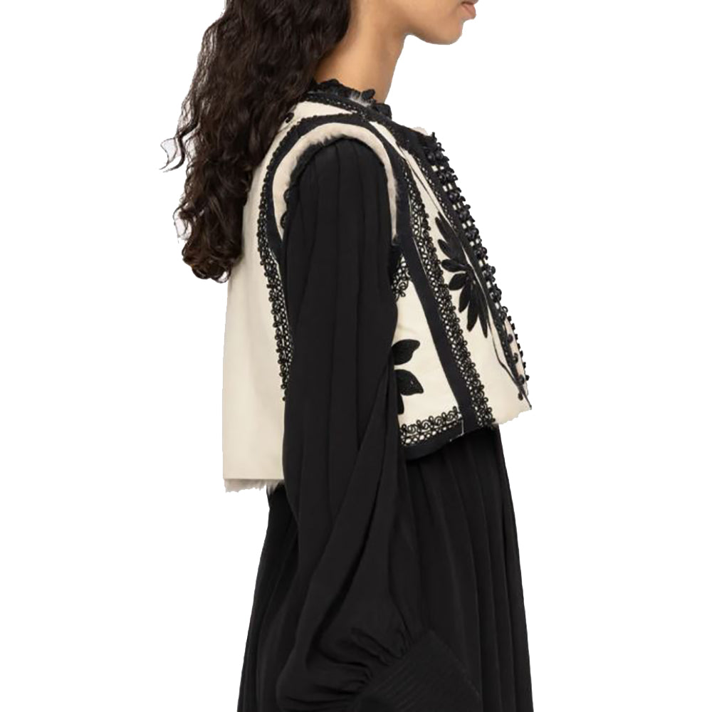 The Ambrose soutache vest features detailed embroidery throughout, cropped silhouette, and faux fur lining.