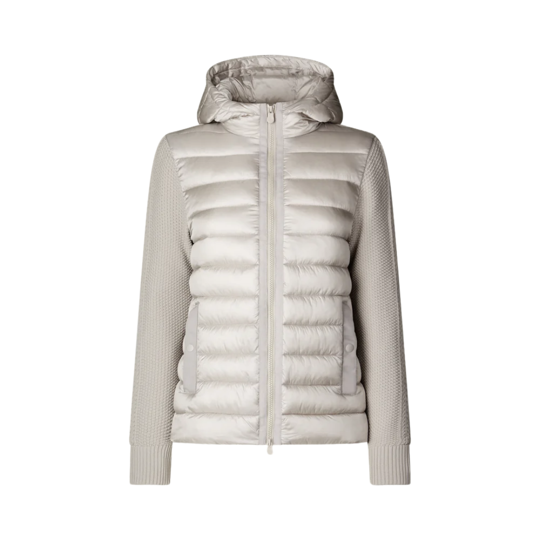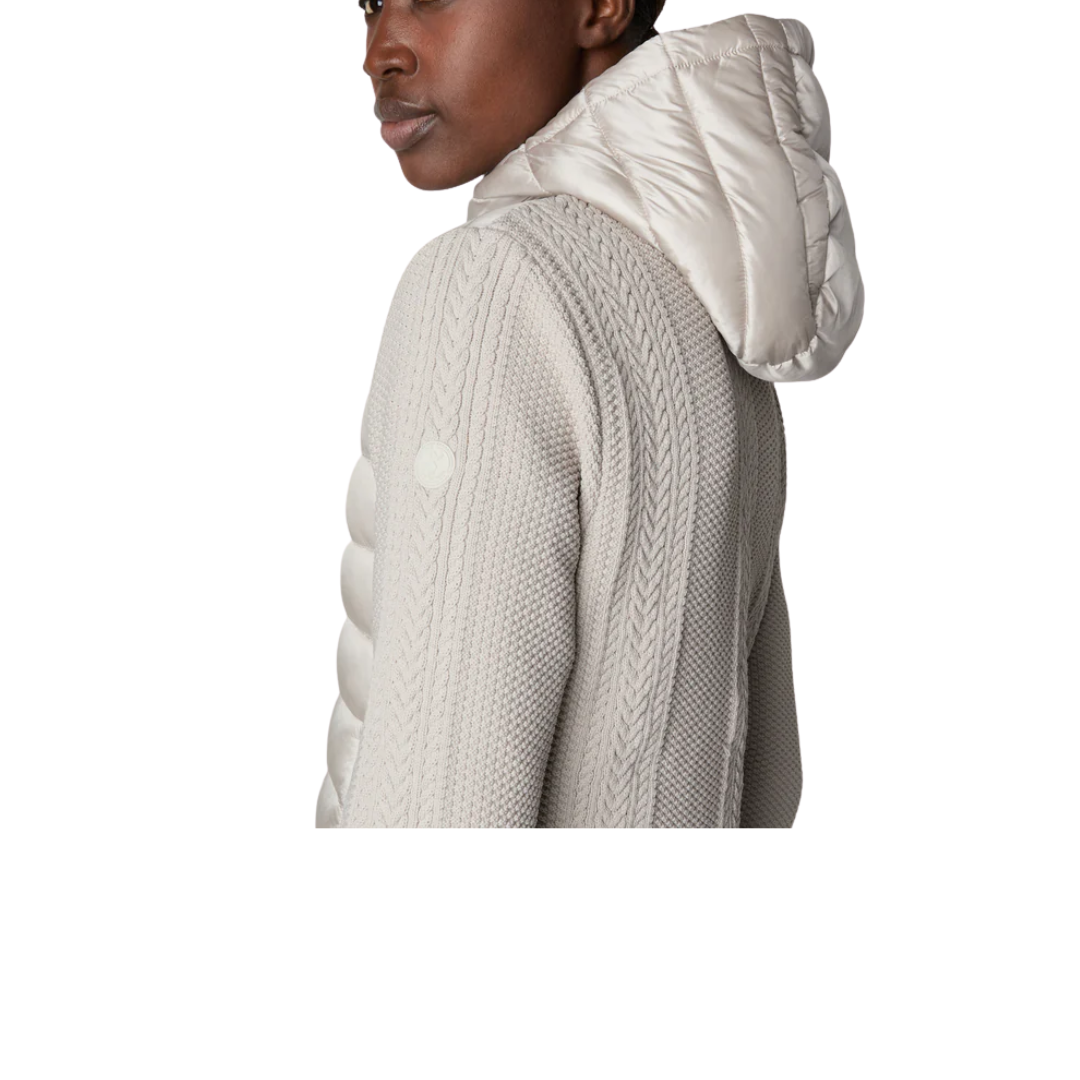 The Ozma model women’s jacket brings contrast to the forefront, combining quilted panels with soft diamond-knit textures. The hood and front offer light padding for warmth, while the knitted back and sleeves add flexibility and comfort. A versatile choice for transitional weather, finished with signature details like a tonal logo patch and custom zipper puller.