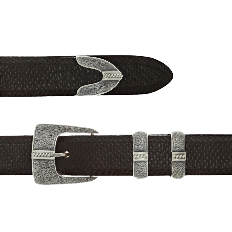 The Clay 1839 features our Clint Orms signature wheatgrass engraving pattern giving this buckle a fine texture. In addition, the Clay 1839 showcases a sterling silver hand wrapped rope centered throughout the buckle, keepers and tip, making this buckle ideal for the modern gentleman or sophisticated woman.