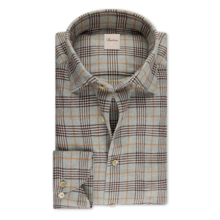 This checked flannel shirt is made of twofold cotton. The shirt is detailed with mother of pearl buttons, single cuffs and a cut away collar.